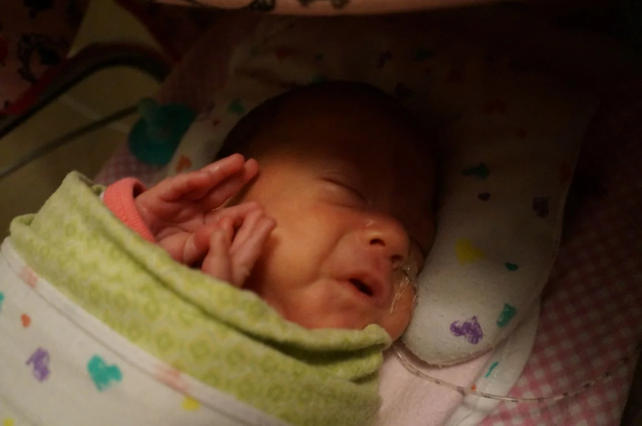 Hattie ate 13 cc of her 1:30 a.m. bottle and slept through her 4:30 feeding. When I arrived this morning at 7:30 a.m. Nurse Kristi was holding Hattie. She'd been crying because she was hungry. I fed her right away and she ate her entire bottle—this baby acts like we never feed her! This was the start to a wonderful day: Hattie ate five full bottles! Hattie's hearing was rechecked today. A nurse came with a fancy rolling computer cart and placed probes on Hattie's shoulder, forehead and neck. She placed sticky earmuffs on Hattie's ears and the test began. Hattie passed on the left ear almost immediately. It took about ten minutes for Hattie's right ear to finish testing but she passed! The nurse was so sweet and shared with me that she was born premature at 28 weeks 20 years ago. She spent four months in the NICU and Dr. Alexander was her doctor. I love all of the miracles I get to see every day around here!